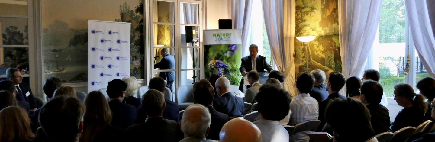 Patrick Ollier, Président de la Métropole du Grand Paris, et Marianne Louradour, Directrice générale de CDC Biodiversité, en présence d’Antoinette Guhl, Vice-présidente de la Métropole du Grand Paris déléguée à la nature en ville, à la biodiversité et à l’agriculture métropolitaine, ont mobilisé les entreprises métropolitaines dans le cadre de l’appel à projets Nature 2050 - Métropole du Grand Paris afin de les encourager à soutenir financièrement les lauréats de la 2ème édition.